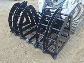 This grapple is nothing short of a MONTSER. The bucket bottom is all ¾” Grade 50 steel with approx. 12” of spacing between the tines. The Cutting edge is a ½” Grade 50 steel and the massive grapples coming over the top are also ½” Grade 50. We overkill this grapple for the big dog skid steers like our Bobcat T770 and put this thing to the test! Serrated teeth on grapples for added grip, all greaseable pivot points, domestic Parker hoses, Parker fittings, and Parker couplers. Grapple opening @ 52 ½”